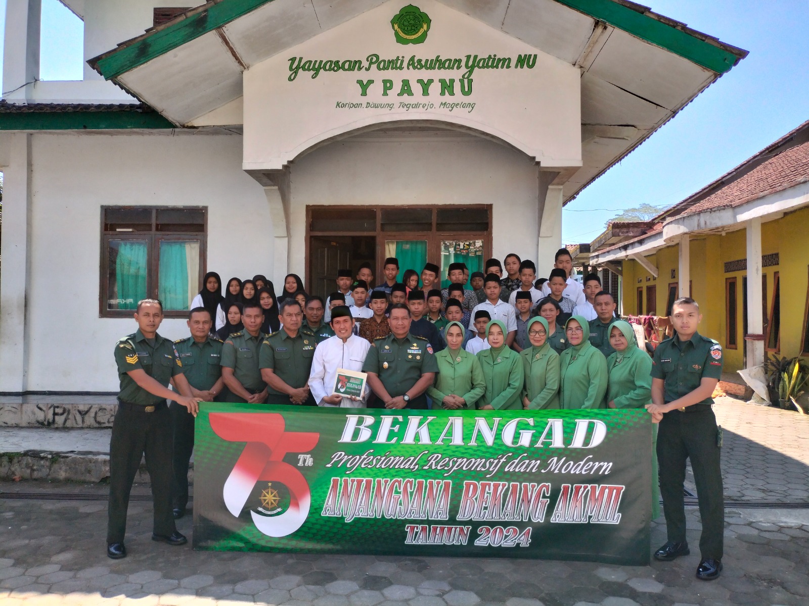 Magelang, –   Dalam rangka momen peringatan Hari Ulang Tahun ke-75 Bekangad (Bekang Angkatan Darat), Kabekang Akmil Letkol Cba Aris Subekti, S.I.P., bersama dengan Ketua Persit Ranting 4 Bekang Cab III Sdirum PCBS Akmil serta seluruh jajaran dan anggota memberikan santunan ke Yayasan Panti Asuhan Yatim NU (YPAYNU) yang dikelola oleh Bapak KH Abdul Hamid Sirodj, terletak di Koripan, Dawung, Tegalrejo, Magelang,  24 Maret 2024.