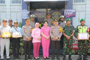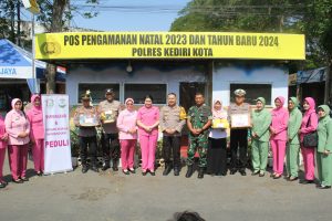 KEDIRI KOTA – Kapolres Kediri Kota AKBP Teddy Chandra, S.I.K., M.Si didampingi Ibu Ketua Bhayangkari Cabang Kediri Kota Ny. Silvi Teddy Chandra bersama dengan Dandim 0809/Kediri Letkol Inf Aris Setiawan, S.H. lakukan pengecekan serta beri motifasi dan semangat Personil Yang Melaksanakan Tugas Di Pos Pengamanan Dan Pos Pelayanan Operasi Lilin Semeru -2023 Yang Berada Di Wilayah Hukum Polres Kediri Kota, Rabu (27/12/23)