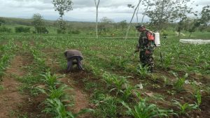 Blitar – Dalam rangka mendukung ketahanan pangan di wilayah binaannya, Babinsa Koramil 0808/18 Panggungrejo Kodim 0808/Blitar Serka Jemingan, melaksanakan kegiatan membantu penyemprotan tanaman jagung di lahan milik Bapak Kateno, bertempat di Dusun Bejirejo RT. 03 RW. 01 Desa Kalitengah Kec. Panggungrejo Kab. Blitar, Sabtu (27/1/2024).