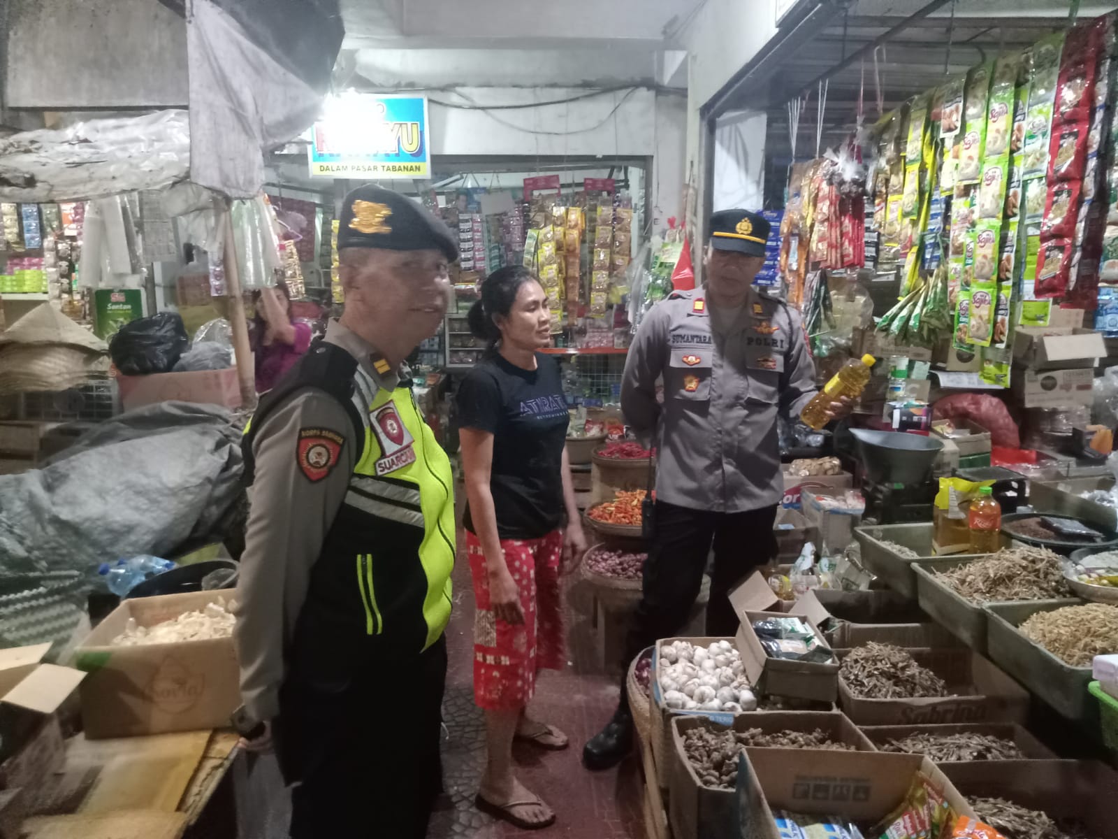 Dalam patroli tersebut Kapolsek bersama personil memberikan himbauan Kamtibmas kepada para pedagang, pengunjung pasar di pasar tradisional Dauh pala, pasar Tabanan untuk selalu menjaga situasi keamanan dan ketertiban. “Mari kita jaga secara bersama sama situasi yang telah kondusif ini. Kepada para pengunjung yang hendaknya saat parkir sepeda motor agar selalu mengunci stang motornya, sehingga tidak ada kuncinya masih nyantol. Jangan menaruh barang berharga ataupun STNK di bawah jok motor, kepada ibu ibu Kami himbau untuk tidak menggunakan perhiasan dari emas yang berlebihan, sehingga tidak mengundang pelaku kejahatan”.Kata Kapolsek Tabanan.