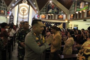 KEDIRI KOTA – Kapolres Kediri Kota AKBP Teddy Chandra S.IK., M.Si bersama Penjabat (Pj) Walikota Kediri Dr Ir Zanariah MSi, serta Forkopimda melakukan kunjungan ke sejumlah gereja yang sedang melaksanakan misa di malam Hari Raya Natal, Minggu (24/12/2023).