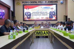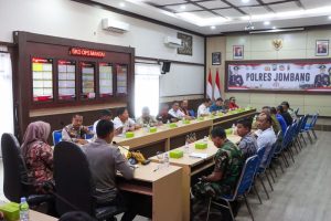 Kapolres Jombang AKBP Eko Bagus Riyadi memimpin langsung rapat koordinasi (Rakor) dengan sejumlah instansi di Ruang JCC Polres Jombang, Jumat (19/01/2024). Sejumlah instansi hadir mulai dari Staf Ahli Bupati, Dinas PUPR Jombang, Dinas Perhubungan, Satpol PP, Dinas Kesehatan, PT MHI hingga sejumlah pengusaha dan komunitas relawan di Jombang.