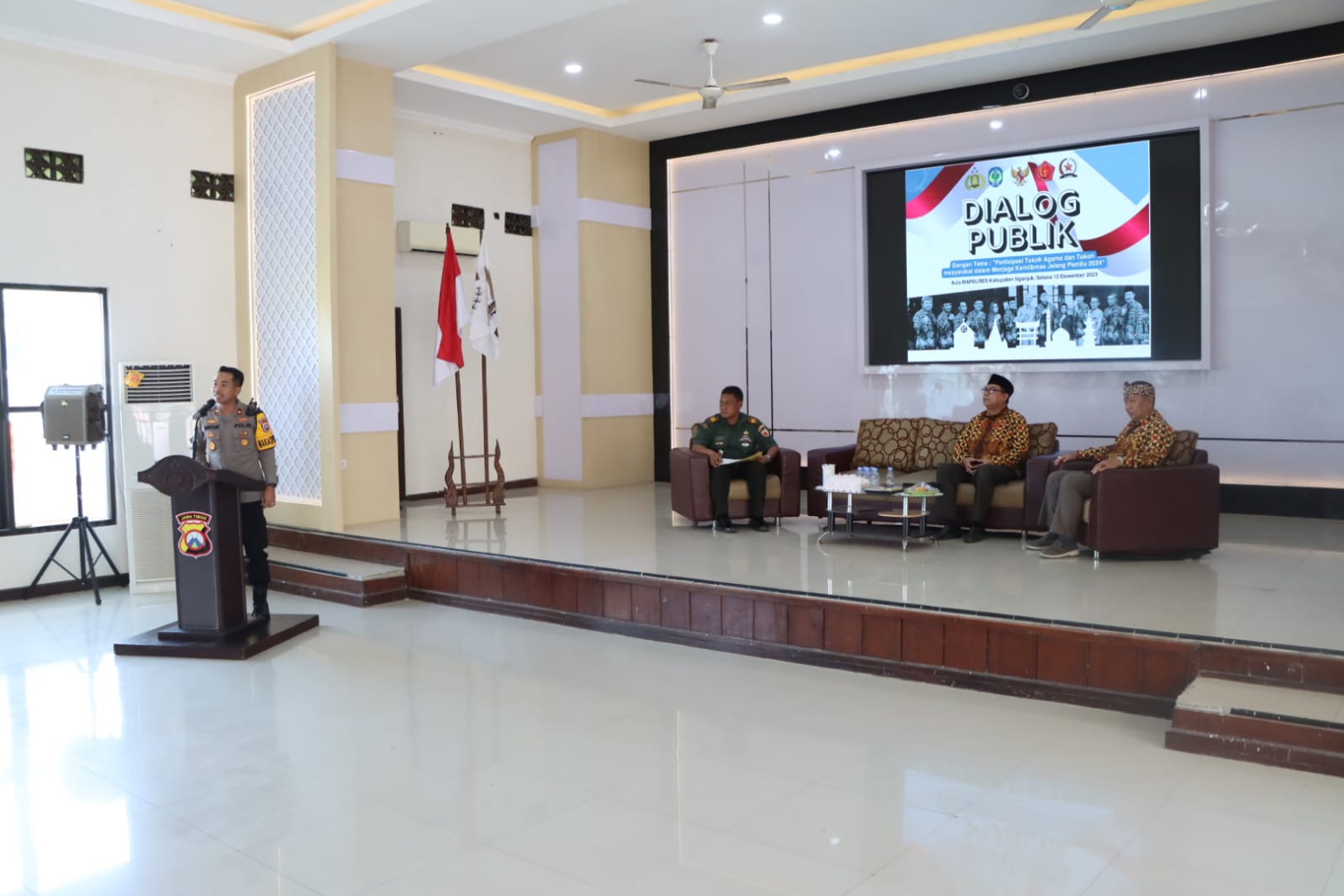 NGANJUK. – 12 Desember 2023 – Polres Nganjuk hari ini menggelar “Dialog Publik” yang melibatkan tokoh masyarakat dan tokoh lintas agama dalam upaya menjaga Kamtibmas menjelang Pemilu 2024, Selasa (12/12/2023).