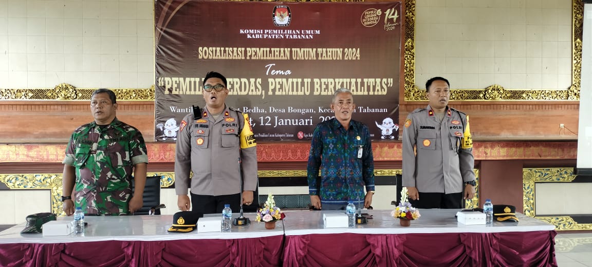 TABANAN, BALI – Untuk menuju pemilu tahun 2024 dengan aman dan berkualitas dengan pemilih cerdas, Polres Tabanan Bersinergi dengan Kodim 1619 dan KPU memberikan edukasi kepada masyarakat Desa Bongan Kec/ Kab Tabanan bertempat di Wantilan Desa Adat Bedha, Jumat ( 12/1/2024 ) pukul 09.00 s/d 10.55 wita.