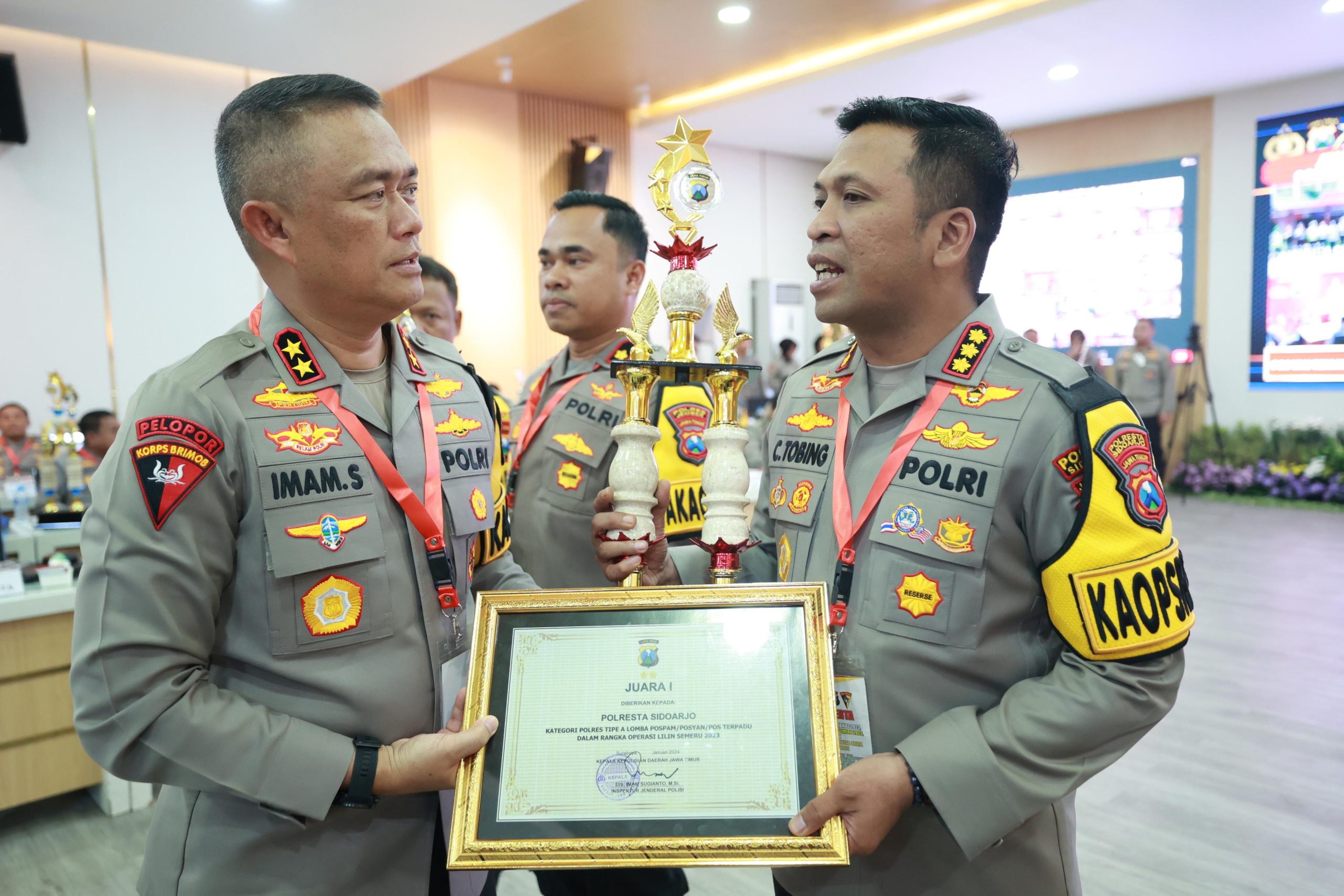 Pada kesempatan kegiatan Analisa dan Evaluasi (Anev) Situasi Keamanan dan Ketertiban Masyarakat (Sitkamtibmas), yang dilaksanakan di Rupatama, Mapolda Jatim, Selasa (9/1/2024 yang lalu, Kapolda Jatim Irjen Pol. Imam Sugianto didampingi Wakapolda Jatim Brigjen Pol. Ahmad Yusep Gunawan memberikan tiga penghargaan kepada Polresta Sidoarjo yang diterima Kombes Pol. Christian Tobing.