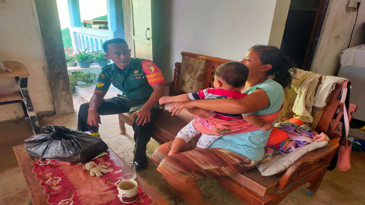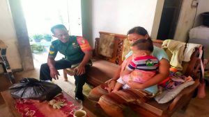 BLITAR – Babinsa Koramil 0808/20 Sananwetan Kodim 0808/Blitar Sertu Eko Joko Santoso, melaksanakan kegiatan memberikan bantuan sosial kepada Ibu Vita Wilandari yang mempunyai anak stunting. Kegiatan ini, dilaksanakan di Jalan Imam Bonjol Kelurahan Sananwetan Kecamatan Sananwetan Kota Blitar, Senin (11/12/2023).